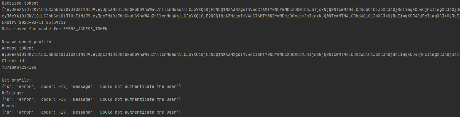 Refer to snapshot for the output logs (see that the token received through authorization flow and the one used in FyersModel are the same)