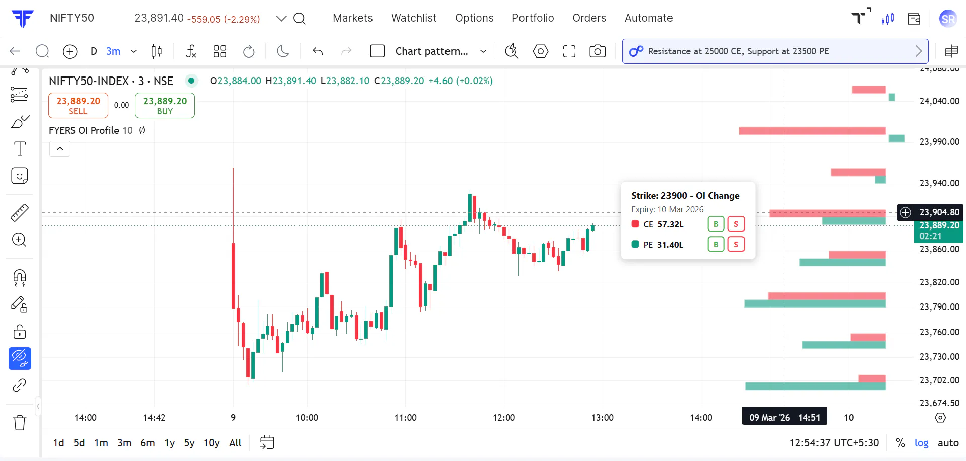 FYERS OI Profile plots open interest as horizontal bars on the price scale.