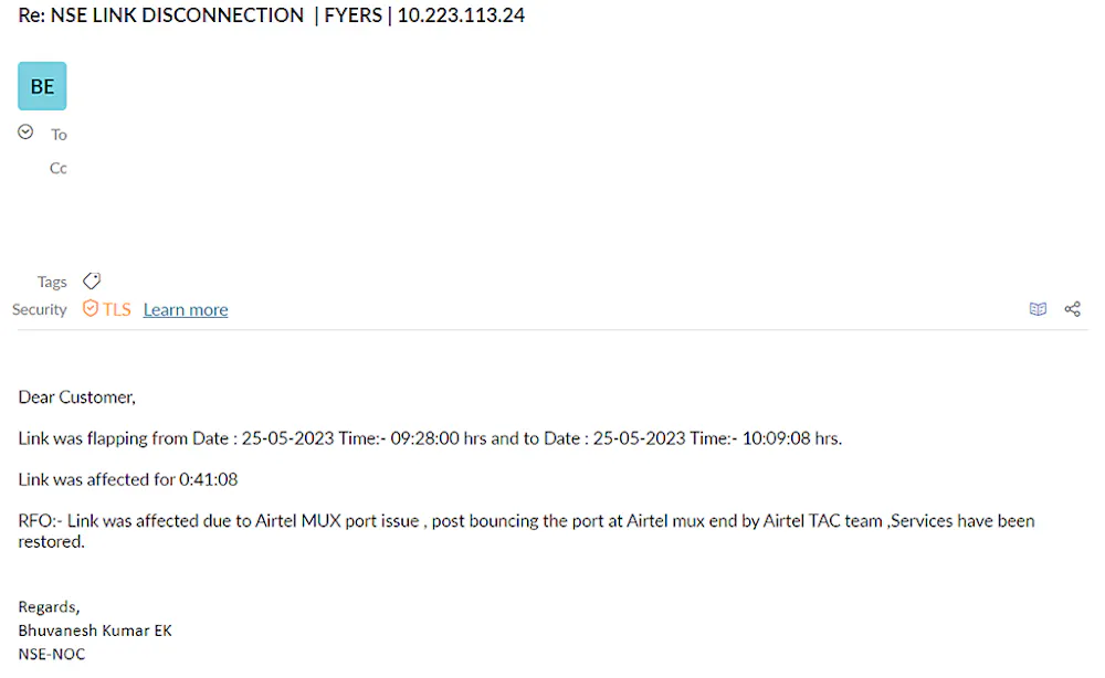To illustrate our approach to handling technical glitches, let us take a look at a recent case study of a leased line disconnection from our primary Internet Service Provider (ISP), Bharti Airtel, on 25th May 2023.
