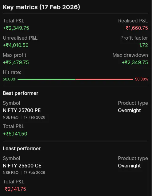 It highlights the numbers that actually help you improve. You can see your Max Profit, which shows the highest point your P&L reached during the day, along with your Max Drawdown, which captures how much you slipped from that peak.